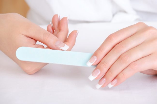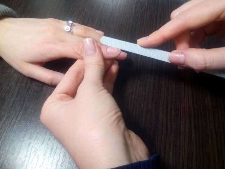 - Придание ногтям необходимой формы при помощи пилочки или бафа (эту процедуру можно проводить только на сухих ноготках, в противном случае ногтевая пластинка может начать расслаиваться);