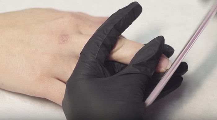 Для этого пилочку подкладываем под свободный край и осторожно перемещаемся от кутикулы к краю ногтя
