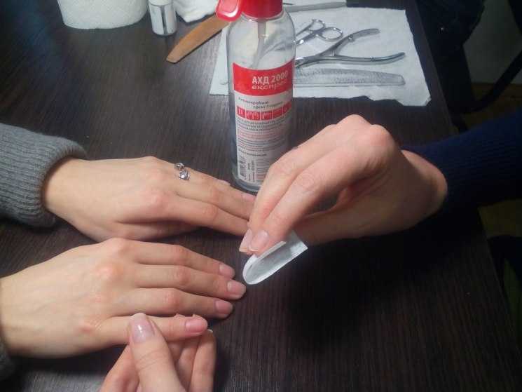 Подготовка рук клиента с помощью кожного антисептика. Мастер при этом работает в одноразовых перчатках.