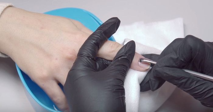 Поэтапная инструкция подразумевает после удаления кутикулы убрать наросты на боковых валиках, боковых пазухах и рядом с поперечной бороздкой ногтевого ложа.