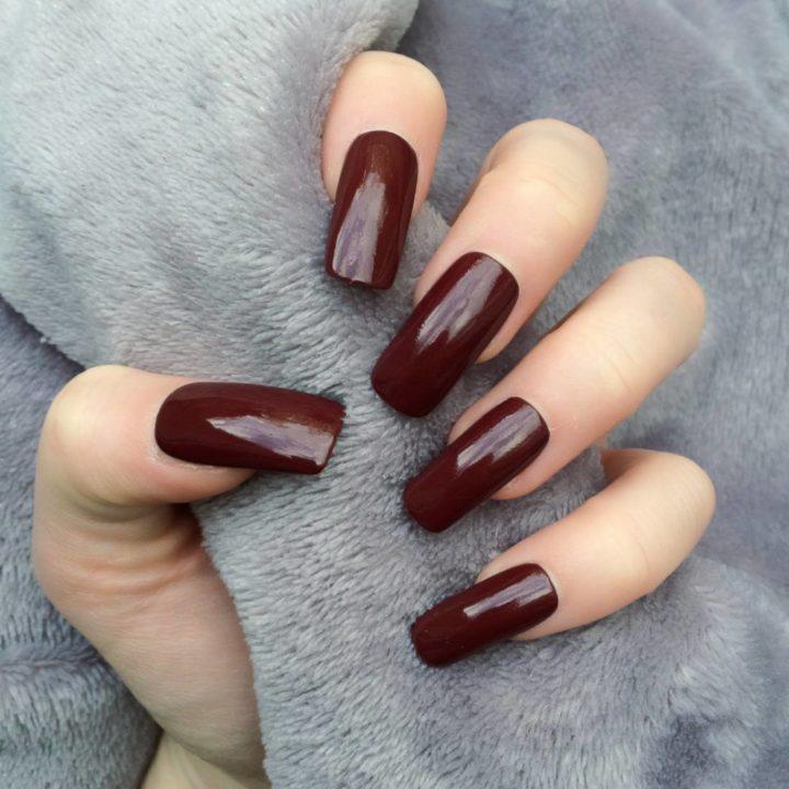 Шикарно на прямоугольных длинных ноготках смотрится однотонный маникюр. Причем он может быть как светлых, так и темных тонов.
