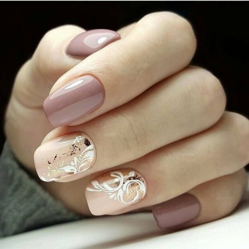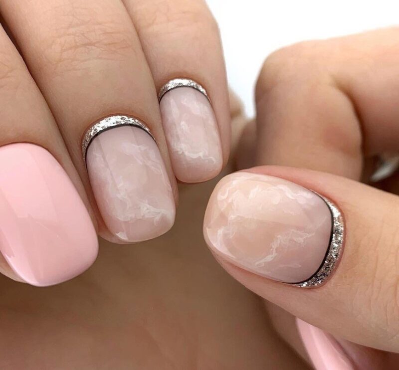 Нюдовые оттенки хорошо смотрятся с небольшим количеством блестков, с рисунками, выполненных в более насыщенных, но спокойных тонах. Как правило, контрастные рисунки встречаются редко. Ведь нюд — это обычно скромность и сдержанность. Интересный вариант декора — нюд с дизайном под мрамор. Имитация мрамора смотрится очень эффектно, но привносит в дизайн строгость.