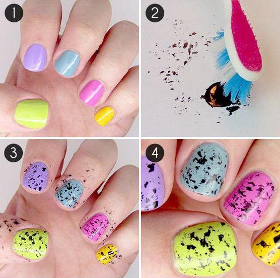 Нанесите несколько капель черного лака на зубную щетку, размажьте по поверхности равномерно с помощью зубочистки. Положите щетку щетиной кверху, с нажимом проведите по щетинкам зубочисткой, подставьте ногти под струю летящих брызг. Когда кляксы высохнут, удалите все попавшие на кожу капли с помощью смоченной в специальной жидкости ватной палочки.