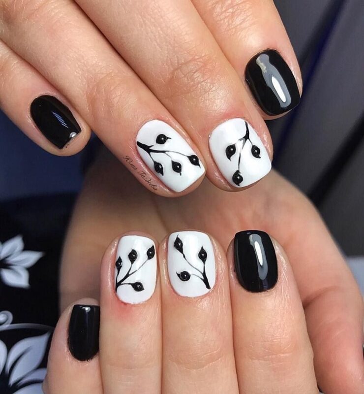На коротких ногтях востребованы рисунки не только в пастельных тонах. Для любителей темных цветов при создании праздничного дизайна можно использовать блестки, сочетание белого с серебром, золотом. А для повседневной носки интересно смотрятся небольшие рисунки птиц или забавных мультяшных животных.