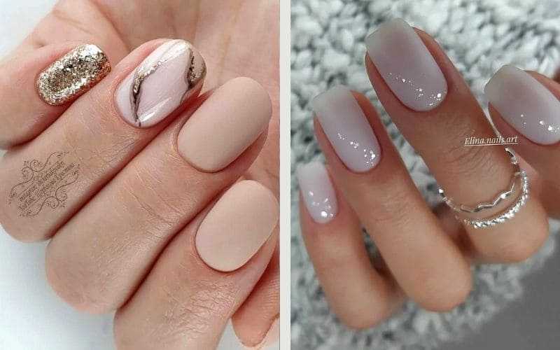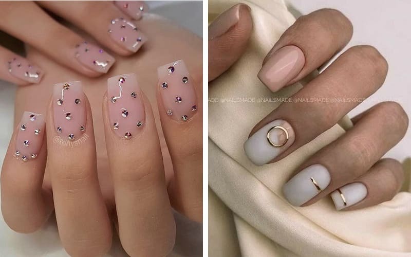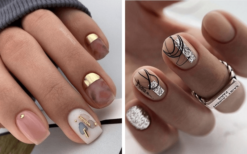 Минималистичные рисунки и вкрапления с серебром, золотом в сочетании с нюдом всегда универсальны. Они подходят как для носки в повседневной жизни, так и для создания вечерних образов.