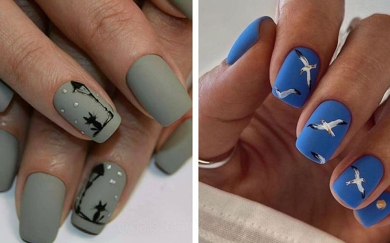 На коротких ногтях востребованы рисунки не только в пастельных тонах. Для любителей темных цветов при создании праздничного дизайна можно использовать блестки, сочетание белого с серебром, золотом. А для повседневной носки интересно смотрятся небольшие рисунки птиц или забавных мультяшных животных.