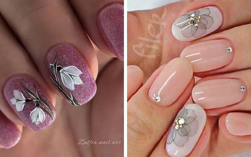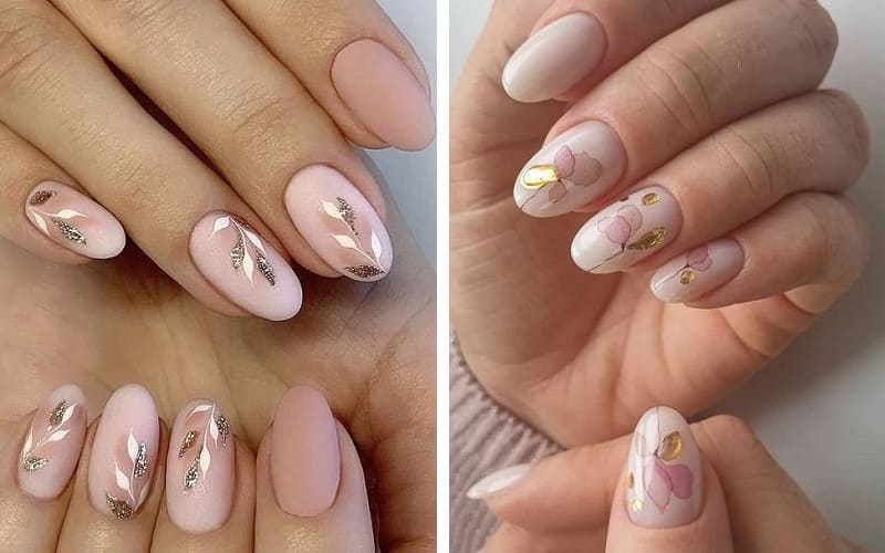 Нюдовые оттенки хорошо смотрятся с небольшим количеством блестков, с рисунками, выполненных в более насыщенных, но спокойных тонах. Как правило, контрастные рисунки встречаются редко. Ведь нюд — это обычно скромность и сдержанность. Интересный вариант декора — нюд с дизайном под мрамор. Имитация мрамора смотрится очень эффектно, но привносит в дизайн строгость.