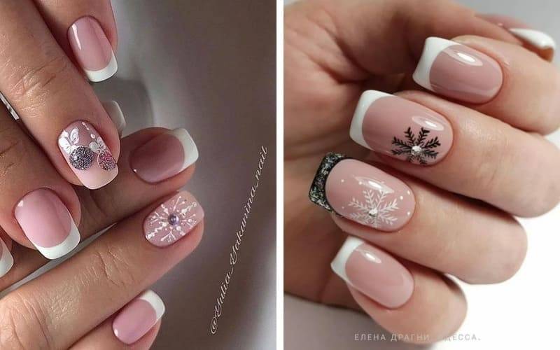 Короткие ногти — это не повод отказываться от нарядных, праздничных образов. Новогодние снежинки, елочные шары — незаменимые атрибуты Нового года. Особенно, если нужно украсить маникюр в нюдовых тонах.