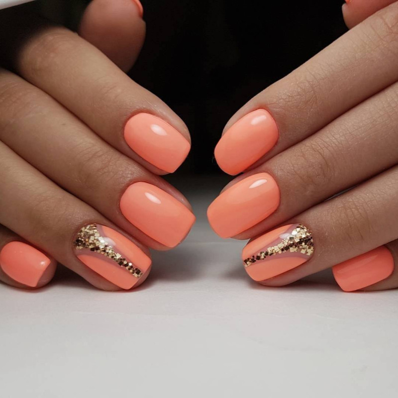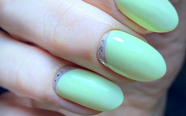 Нередко летом однотонный маникюр украшают россыпью блесток