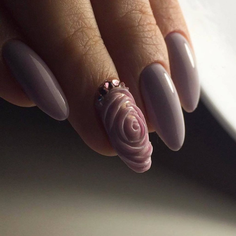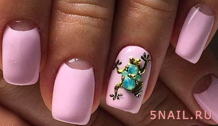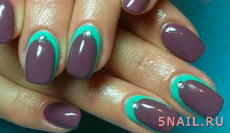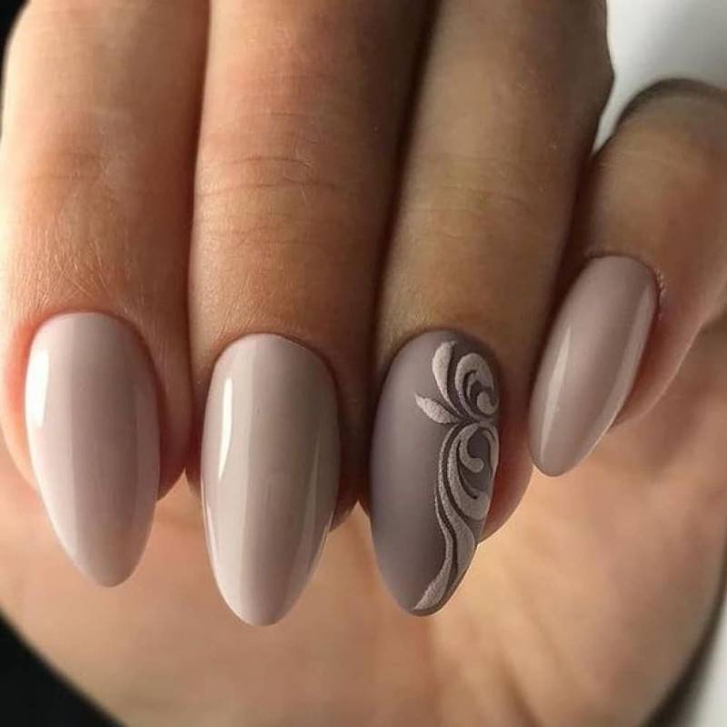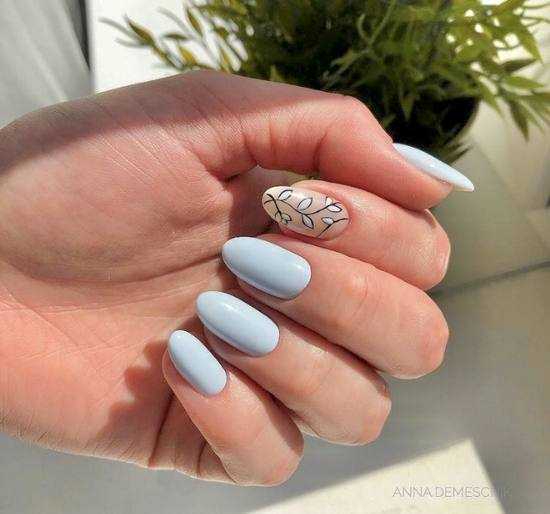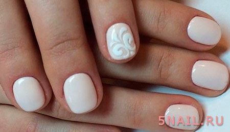 В том случае если однотонный маникюр, выполненный в данной цветовой гамме, кажется очень блеклым и скучным, то можно добавить немного декора — какой-нибудь рисунок небольшого размера и выделить его кончик при помощи цветного лака в технике френч.