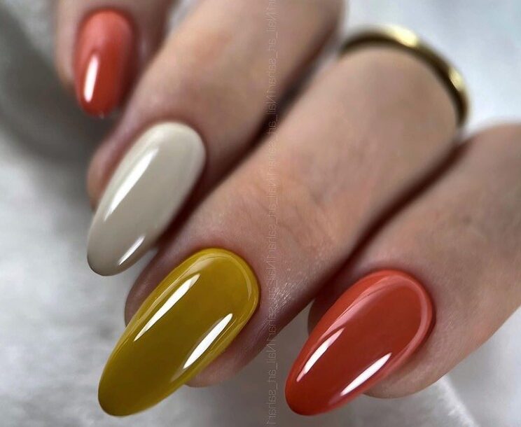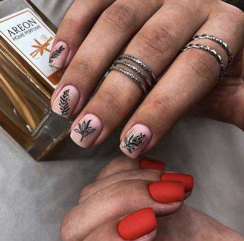 Сейчас в тренде маникюр с разным дизайном ногтей. Здесь требуется талант мастера, способный изобразить рисунок, совместить сезонные мотивы и различные стили. Допустимы яркие цветовые сочетания.