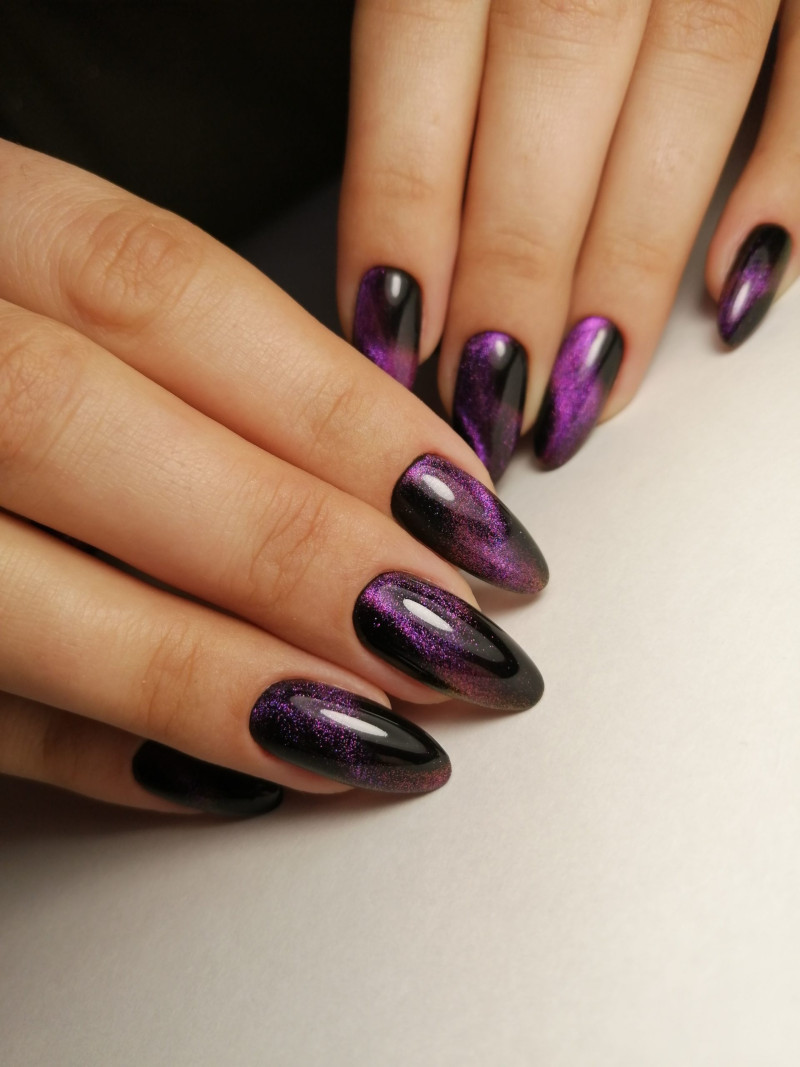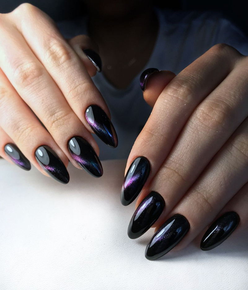 Общепризнанный тренд 2021 года «кошачий глаз» сохранит свои лидирующие позиции в 2022 году. Ногти с таким дизайном смотрятся чрезвычайно привлекательно. Ещё большего эффекта можно достичь, если выполнять эту технику на тёмной основе. Можно добавить акценты с помощью других приёмов на нескольких ногтях, например стразы или рисунки.