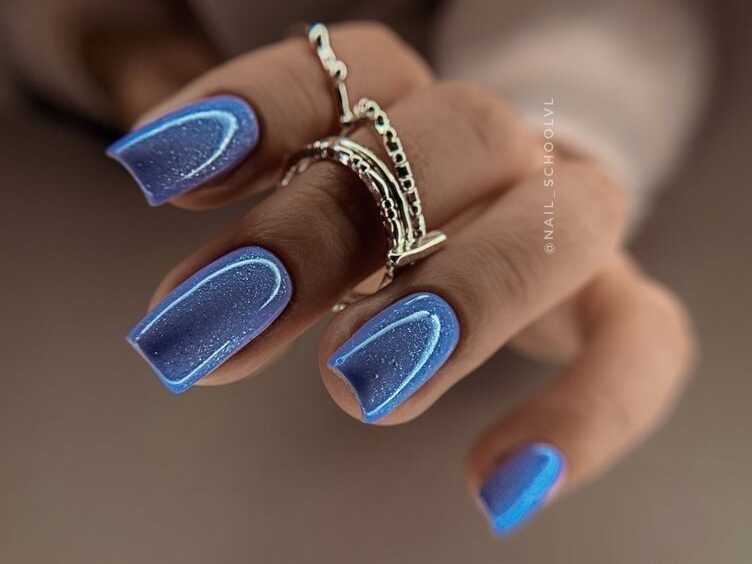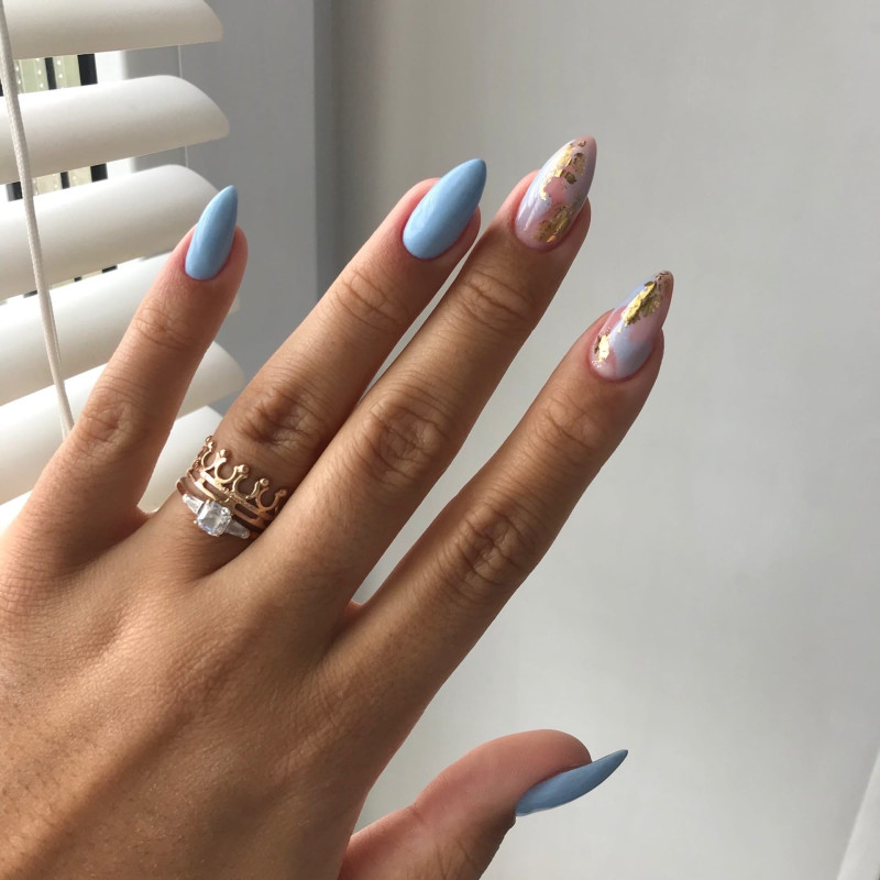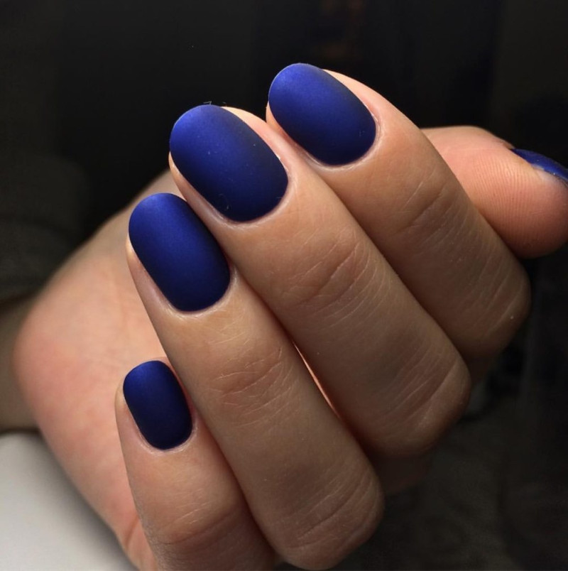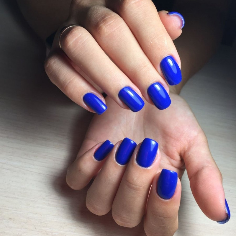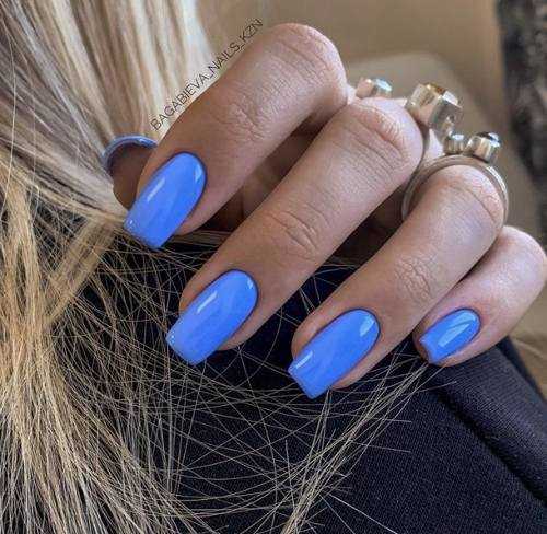 Маникюр в тон на длинных ногтях — отличный офисный вариант, отлично подойдет для деловых переговоров. Молодые девушки, которые хотят быть в центре внимания, могут выбрать не только светлые, но и более яркие и интересные тона. Хороший пример — синий цвет покрытия.