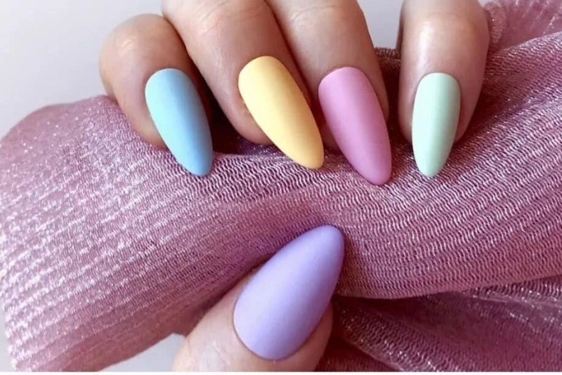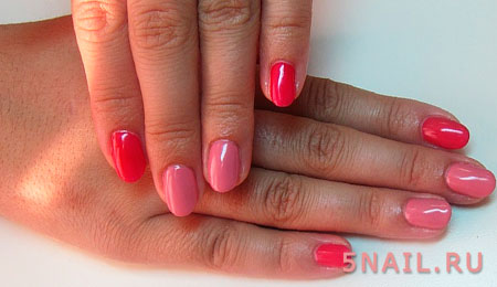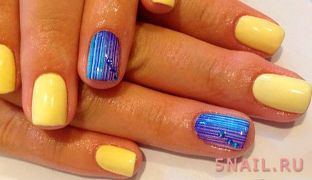 Если никаких декоративных материалов для маникюра у вас нет, но есть однотонные лаки других цветов, то можете экспериментировать и с ними. Например, накрасить один ноготь синим лаком, второй – голубым, третий – розовым и так дальше.