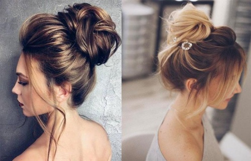 - деловые высокие прически могут быть сделаны в виде пучка, такое расположение придает укладке более эффектный вид. При желании создать более сдержанный и лаконичный лук рекомендуется располагать пучок на затылке;