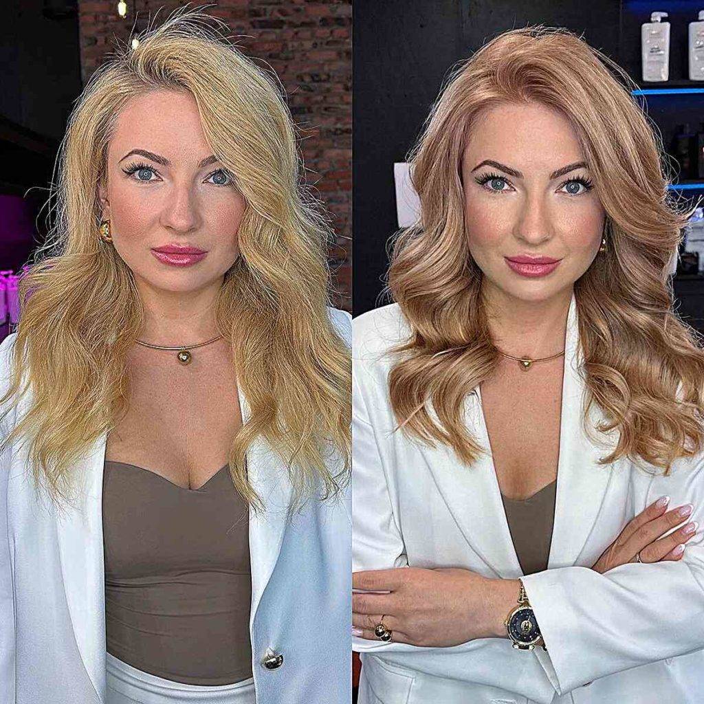 Цвет волос «розовое золото» — модный выбор для профессиональных женщин, придающий теплоту и изысканность. Этот мягкий розово-золотистый оттенок придает образу утонченность