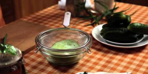 - Огуречную кашицу сложить в глубокую стеклянную емкость, добавить холодную воду, прошедшую кипячение. Примерное соотношение – по стакану на каждый огурец среднего размера (130-150 г).