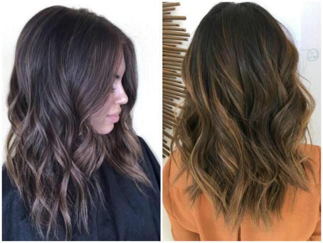 Для темных волос допускаются любые эксперименты. Окрашивание на средние волосы позволяет создавать плавные и контрастные переходы, сделать блики и акценты. Модная цветовая палитра для темных локонов включает медовые, кофейные и карамельные оттенки. Самыми актуальными будут пепельные тона, которые можно сочетать практически с любым основным цветом.