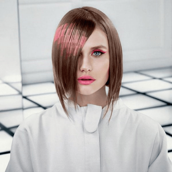 - Контрастная челка. Этот вариант лучше всего смотрится на таких стрижках, как боб, каре или длинных густых локонах. Главное условие – ровная густая или косая челка до линии роста бровей. Челка должна резко контрастировать и в то же время сочетаться с основной массой волос. К примеру, оттенок «глясе» дополняет лиловый или пепельный, песочный блонд сочетается с розовым цветом, а пепельный – с синим и сиреневым.
