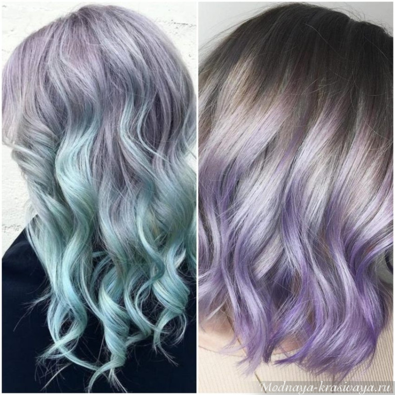 Пепельный цвет хорошо сочетается с холодными оттенками. Для создания эффектных переходов можно использовать белое и кофейное окрашивание. Хорошо будут смотреться растяжки, в которых используется серый, синий, или голубой цвет.
