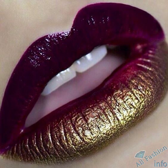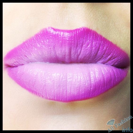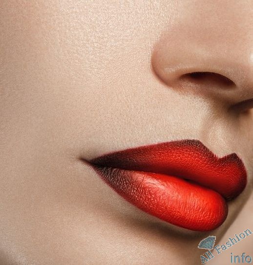 Переход между оттенками может быть как плавным, так и резким, когда верхняя губа закрашивается одним цветом, а нижняя другим, но сочетающимся с первым. При этом на края обычно наносят более темный тон, а в центр – светлый, чтобы визуально сделать губки полнее.