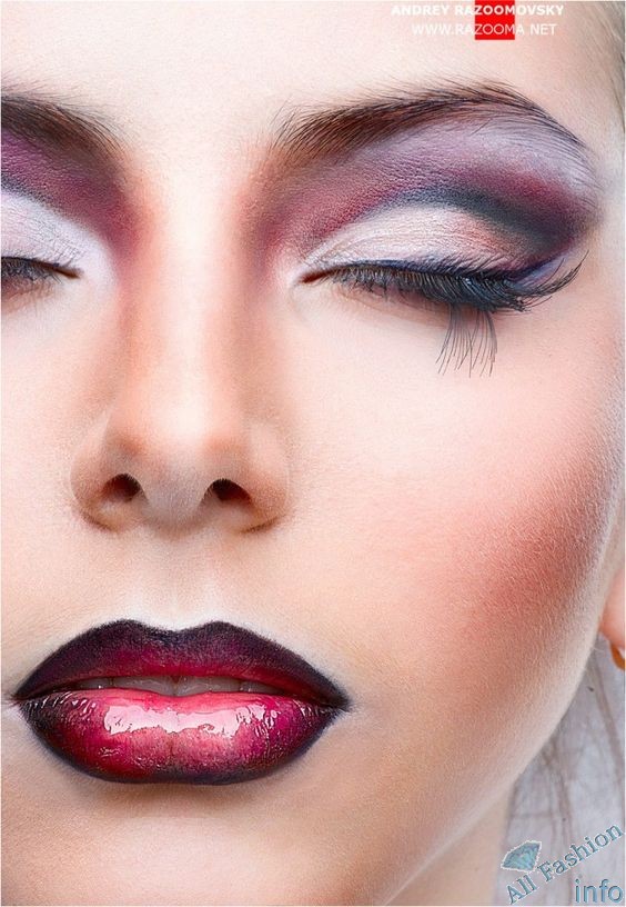 Макияж в технике омбре не боится смелых экспериментов. Цвета декоративной косметики можно выбирать на свое усмотрение. Контур позволено красить не только классическим красным или розовым карандашом, но и насыщенным черным карандашом для глаз.