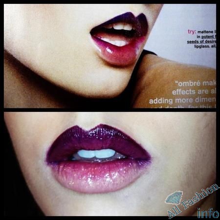 Все большую популярность набирает такая техника макияжа, как омбре на губах, которая заключается в плавном переходе из одного цвета в другой. Он также находит применение в одежде, окрашивании волос, в маникюре