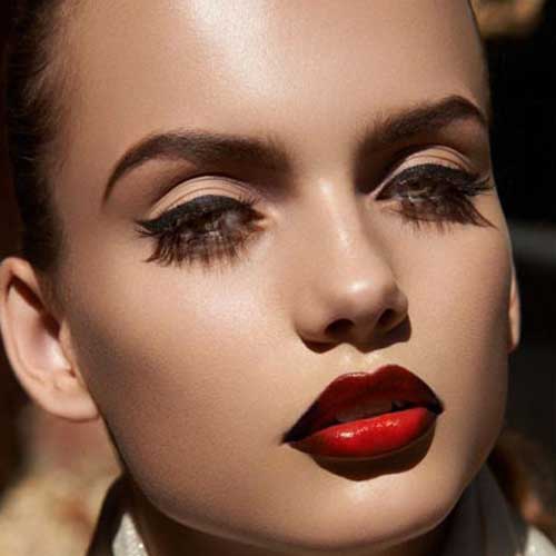 Основа готова и теперь прорисовываем контур губ. Возьмите для этого дела удобную кисть с плоским и острым концом. Начинаем с верхних уголков губы и тёмного оттенка помады. Допустимо выйти за контур всего на несколько миллиметров.