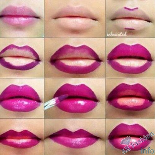 Наносим увлажняющую помаду и немного припудриваем сверху. Прорисовываем линию губ темным карандашом. Обводим нарисованую линию внутри темной помадой, растушевываем. Посредине верхней и нижней губы добавляем более светлую помаду, немного растушевываем чистой кистью или губами друг об дружку. Добавьте прозрачного блеска в серединку. Эффект пухлых сочных губ готов!