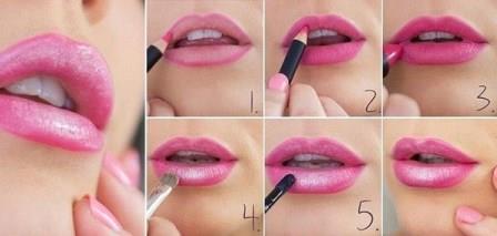 - Припудрить губы и с помощью косметического карандаша для них начертить линии контура по естественным линиям, не выходя за их границы.