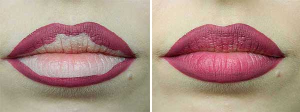- Взять помаду другого оттенка, хорошо прокрасить ей середину рта, а затем тщательно растушевать, чтобы границы были заметны как можно меньше. После этого можно добавить на губы немного блеска, если требуется визуально увеличить их объем.