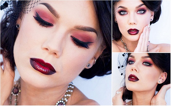 Макияж в технике омбре не боится смелых экспериментов. Цвета декоративной косметики можно выбирать на свое усмотрение. Контур позволено красить не только классическим красным или розовым карандашом, но и насыщенным черным карандашом для глаз.