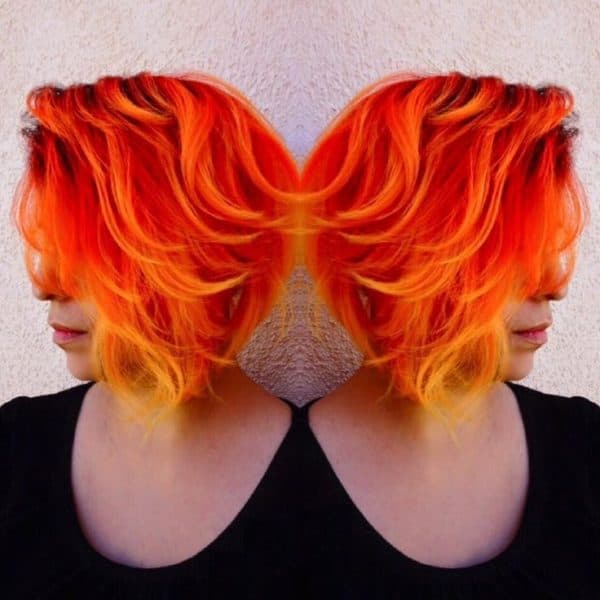 Цветное и «языки пламени» — применяются очень яркие краски – красный, голубой, зеленый и другие. Для создания языков пламени корни должны быть черные или очень темные, а кончики красные, нужен плавный переход.