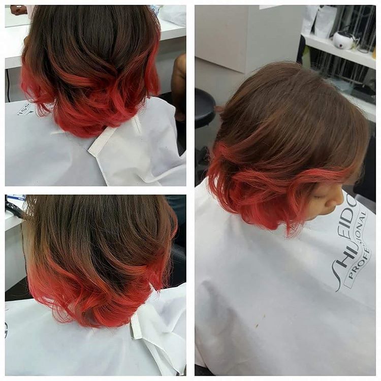 На брюнетках выглядит выгоднее всего, потому что создается контраст цветов и оттенков. Кончики осветляются и на них наносится любой желаемый цвет. Эффектно смотрится красный цвет, коричневый, каштановый, шоколадный и необычные оттенки: синий, зеленый, пепельный.