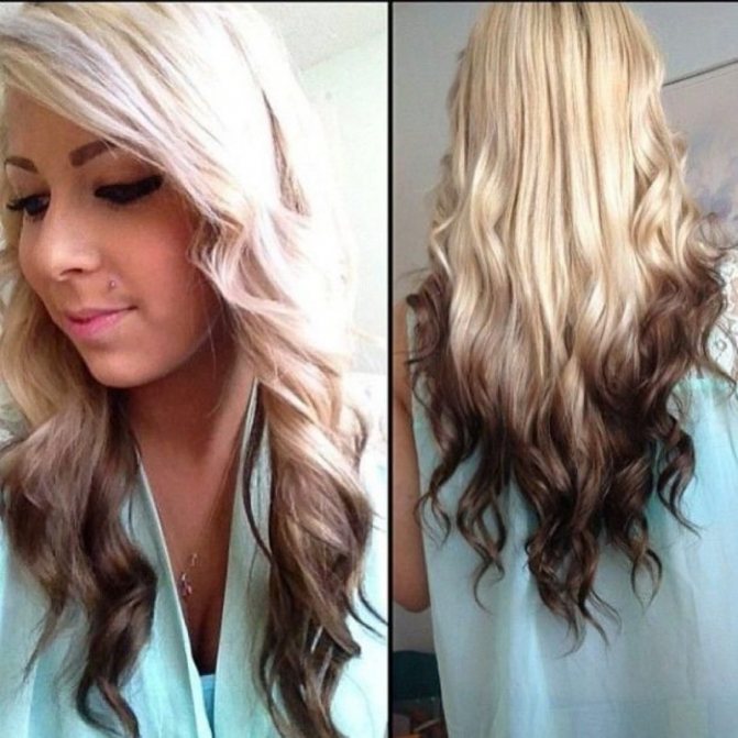 Пожалуй, это самый часто используемый вид, где используются всего два цвета. Граница соединения цветовых оттенков может быть как и плавной, так и резкой, от темных корней к светлым кончикам и наоборот. На фото показано окрашивание кончиков волос в светлый цвет.