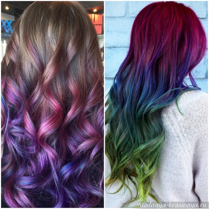 Цветное омбре — градиентная растяжка ярких цветов по длине. Окрашивание подходит молодым и творческим особам. Оно способно подчеркнуть индивидуальность. А в некоторых вариациях бросить вызов обществу.