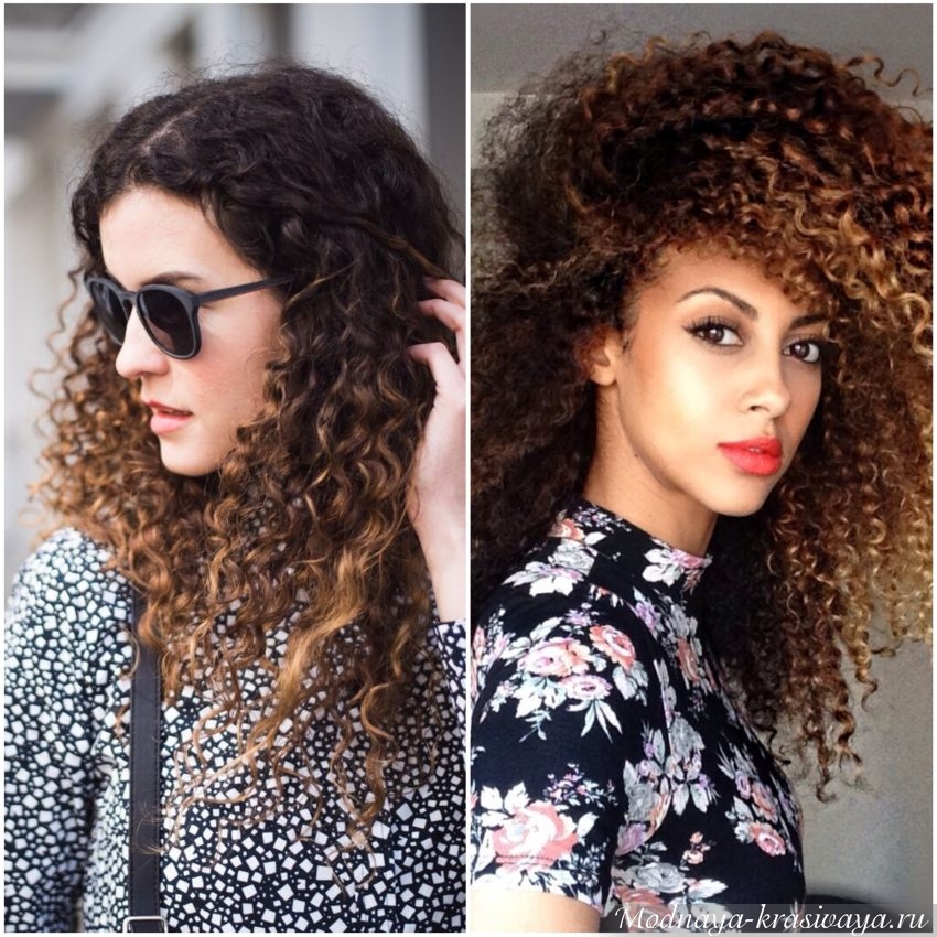 По причине высокой ранимости, кудряшки особенно чувствительны к окрашиванию. Следует подобрать другую технику, например, мелирование, балаяж или брондирование. Но если омбре – предел мечтаний, почему бы и нет? Не пожалейте денег на салонное окрашивание современными красками без сильнодействующих веществ, не выбирайте радикальные цвета и не забывайте про последующий уход. Конечно, такой лаконичности, как на прямых волосах, на завитках добиться невозможно, но создать яркий акцент в образе – получится однозначно.