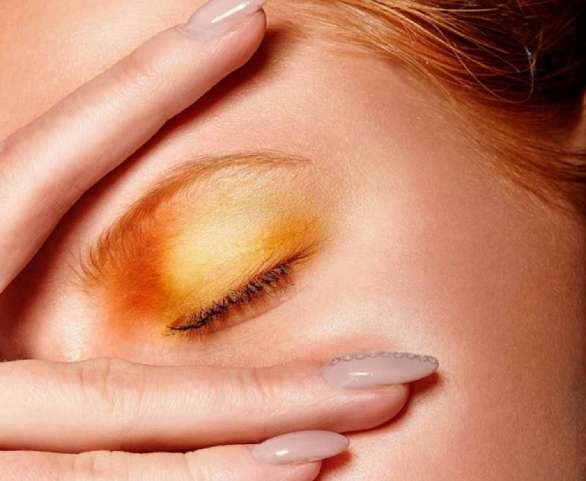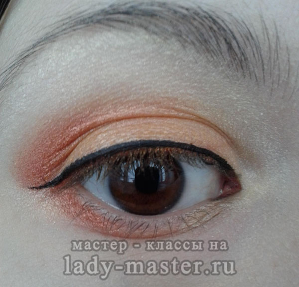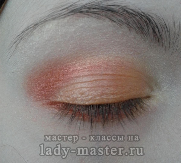На подвижное веко накладываются песочные, оранжевые или другие схожие по цвету тени. Обязательно нужно хорошо растушевать все границы между соседствующими цветами, иначе результат получится не тот, что ожидается.