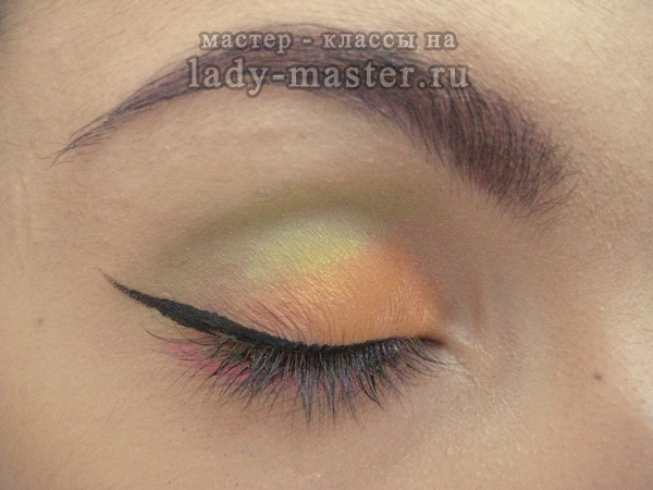 На внутренний уголок глаза накладываются очень светлые желтые тени, и растушевывается граница между двумя оттенками. Следует отметить, что на эту зону также могут быть наложены белые или бежевые тени, большой роли в результате они не сыграют.