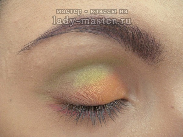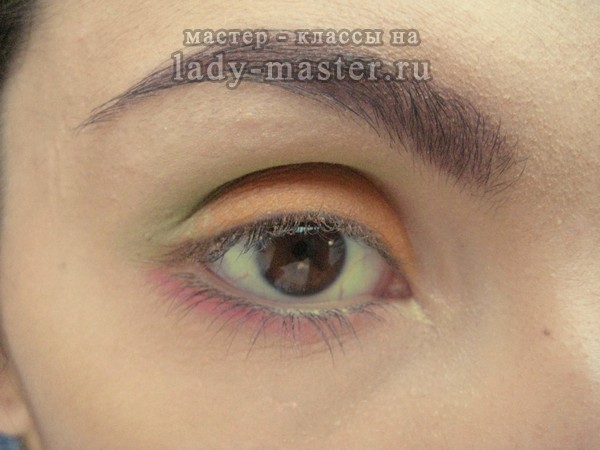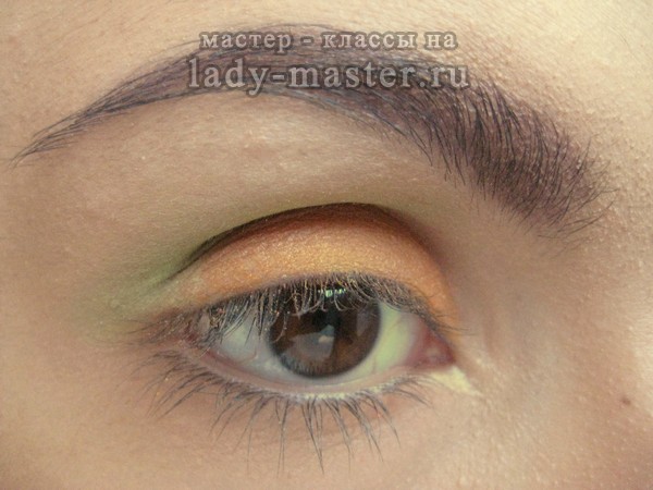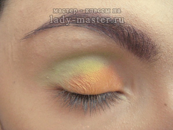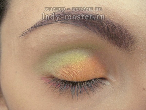 Теперь принимаемся заполнять подвижное веко центральным элементом – оранжевым цветом. На пересечении с ранее занятой салатовой зоной, соблюдайте мягкий переход при помощи растушёвки. Кроме того, не лишним будет пройтись с данными тенями дважды: отнюдь не всегда апельсиновый пигмент с первого раза ложится ровно, а вам необходимо сделать его намного ярче остальных «участников» мейк-апа.