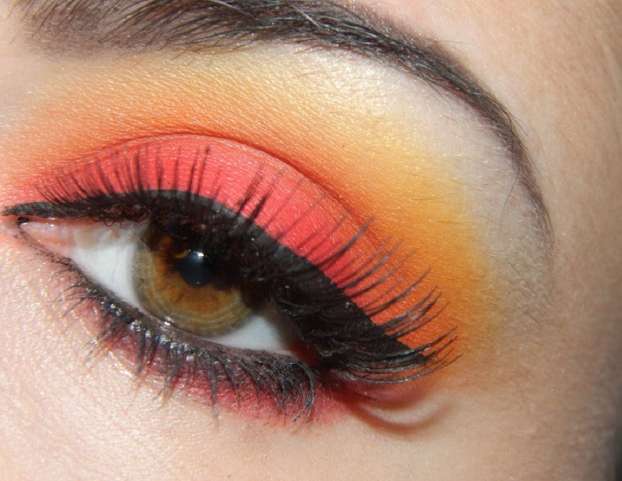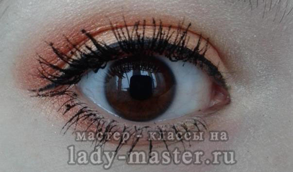 Яркие оранжевые тени при неправильном нанесении делают взор уставшим, а глаза болезненными. Чтобы нейтрализовать неприятный эффект, обязательно используют много туши. Волоски обильно прокрашивают черной массой, прикорневую зону – синим оттенком. Техника придаст яркости и четкости глазкам.