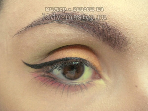 Барышням с невыразительным разрезом очей нельзя наносить оранжевые тени без стрелок. Графичная линия темного карандаша по слизистой верхнего оптически отделяет оттенок косметики от цвета белка глаза. Взгляд становится ярким, а форма приобретает «кошачью» томность.