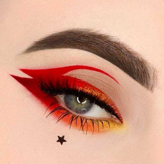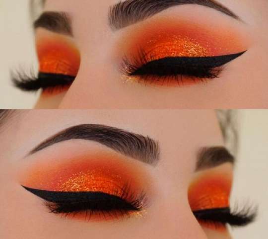 Визаж для праздника с оранжевыми тенями должен быть ярким и контрастным. Обязательным элементом для всех типажей являются графичные брови и объемные ресницы. Драматичные варианты помогут нарастить специалисты салона.