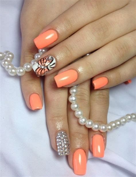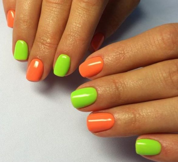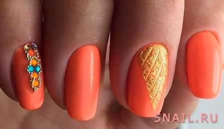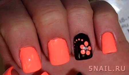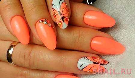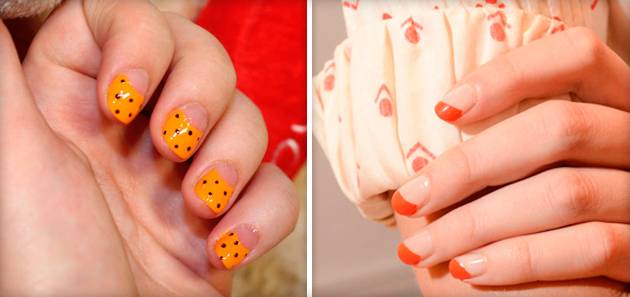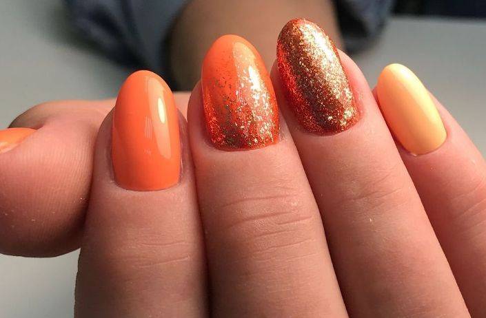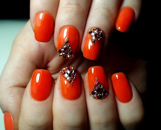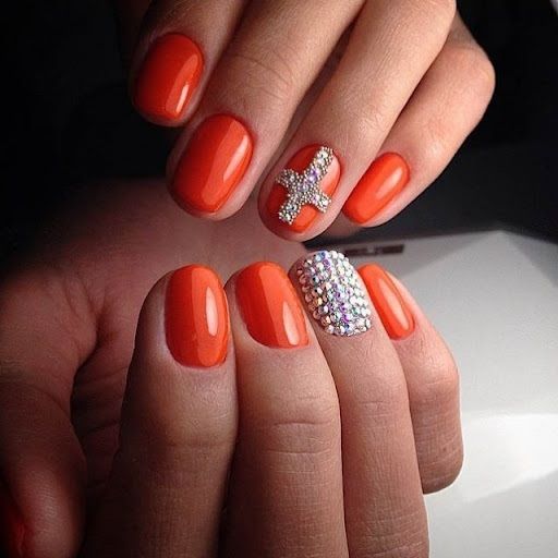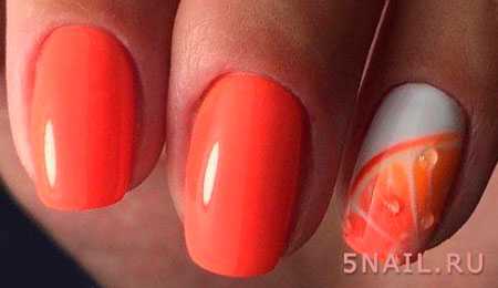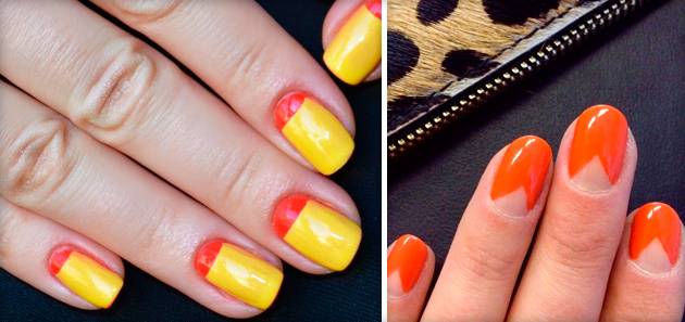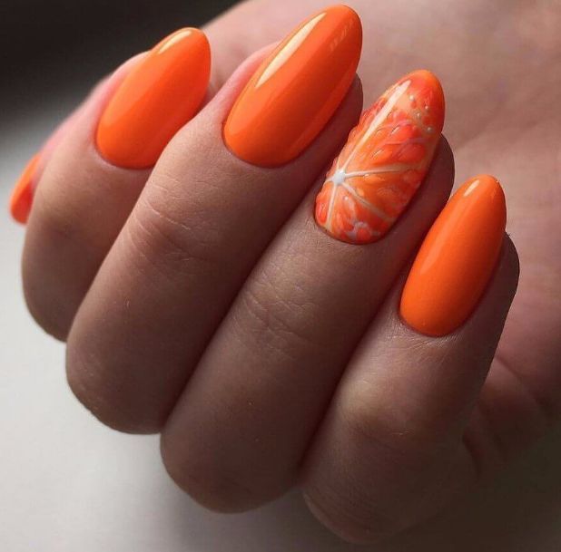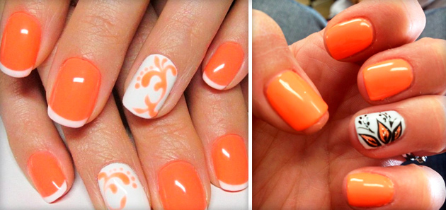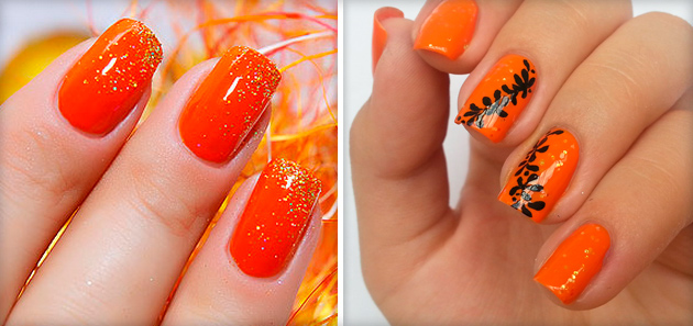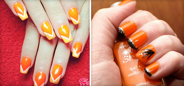 Для коротких ноготков лучше делать мягкий оранжевый маникюр, а на длинные подбирать яркие сочные тона: