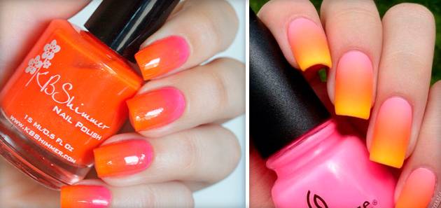 Если темный цвет нанести на кончик ногтя, а ближе к основанию расположить светлый, можно получить нейл-арт, напоминающий актуальный французский маникюр. Чтобы создать насыщенный летний образ, можно выбрать для перехода синий, желтый, зеленый цвета.