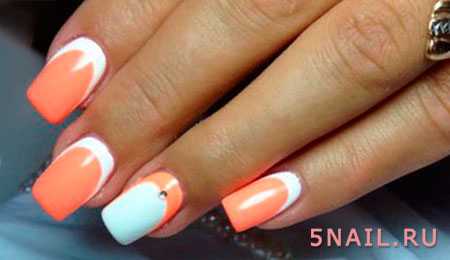 Прекрасным вариантом также станет сочетание оранжевого и белого в маникюре. Так, оранжевый можно нанести в качестве основе, после чего с помощью белого лака выполнить аккуратные точки – это позволит получить . Один из пальчиков можно украсить интересным узором в виде банта, чтобы завершить кокетливую композицию.