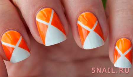 Достаточно оригинально смотрится сочетание лаконичного черно-белого нейл-арта с насыщенным оранжевым акцентом. Для этого можно несколько ногтей покрыть ярким апельсиновым лаком, а на других – выполнить строгий геометрический узор в черно-белой гамме цветов.