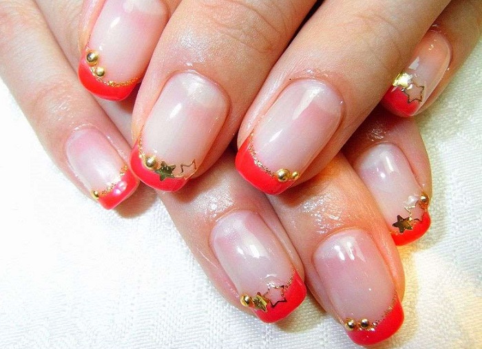 Яркий и насыщенный вариант французского нейл-арта подходит тем девушкам, которые мечтают внести свежесть и оригинальные нотки в свой образ, но при этом стараются придерживаться сдержанности. Для создания такого дизайна основу следует окрасить телесным или прозрачным лаком, а край ногтя покрыть насыщенным оранжевым лаком.