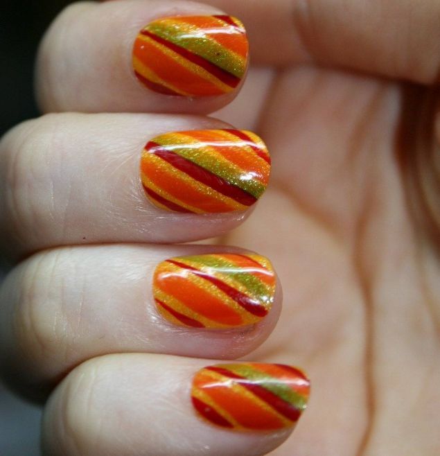 Если простой маникюр с оранжевым лаком кажется вам слишком обычным, добавьте ему оригинальности сочетанием различных цветов и оттенков.