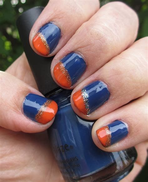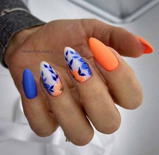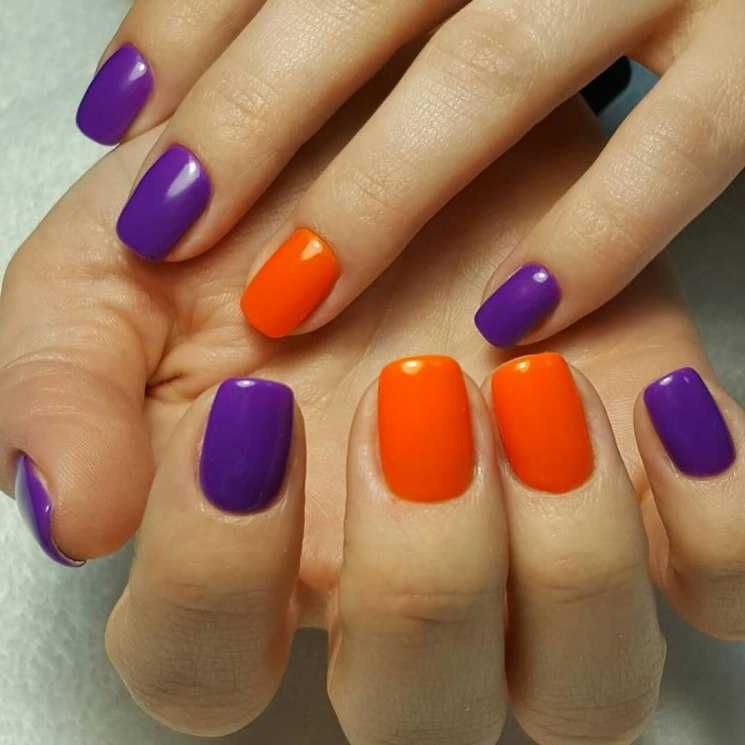 Бытует мнение, что оранжевые лаки органично смотрятся только с тёплыми тонами. Но при правильном подходе оранжевый маникюр может быть выполнен с нанесением дополнительных холодных лаков: Изумрудным, синим и даже чернильным. Задача мастера: Верно выбрать насыщенность тонов и соотнести их с формой ногтей.